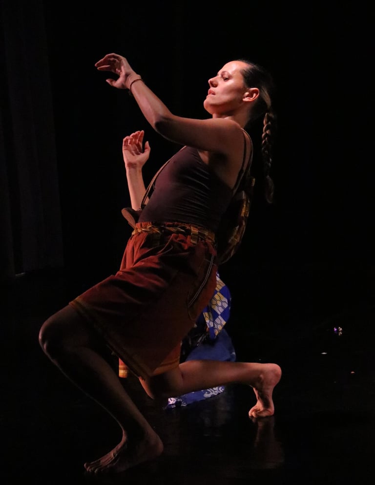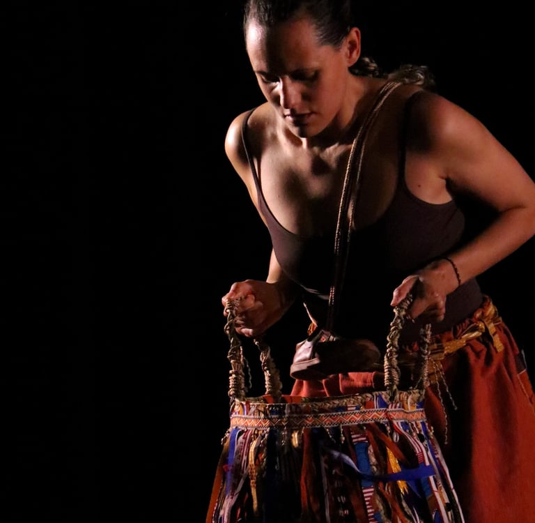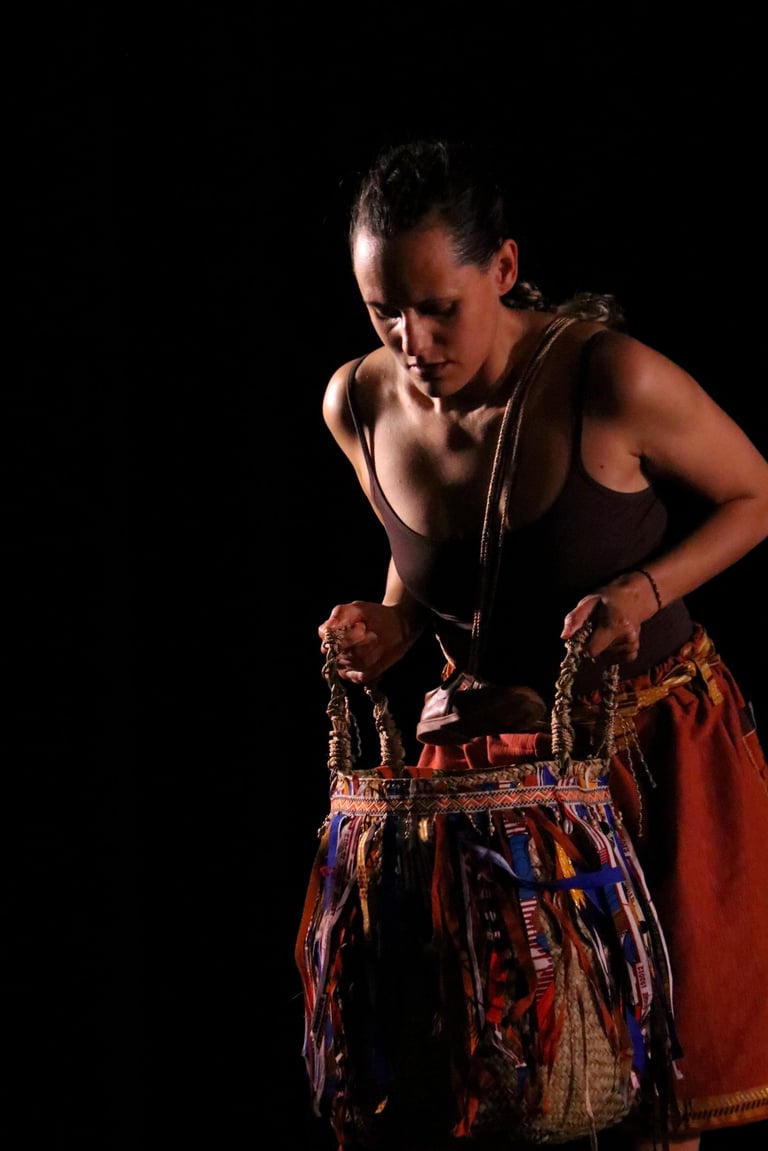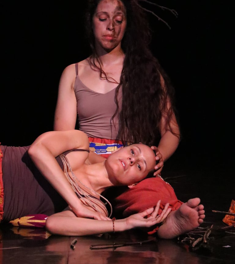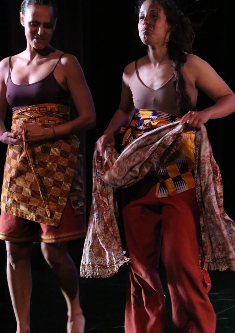 The work is a multilingual conversation held in Portuguese, English, movement, music and song. Standing in the shoes of their elders, two diasporans dance with the tensions of longing and inherited silences. They move with care, mischief and openness, calling for their ancestors to tell them who they are and how they belong.